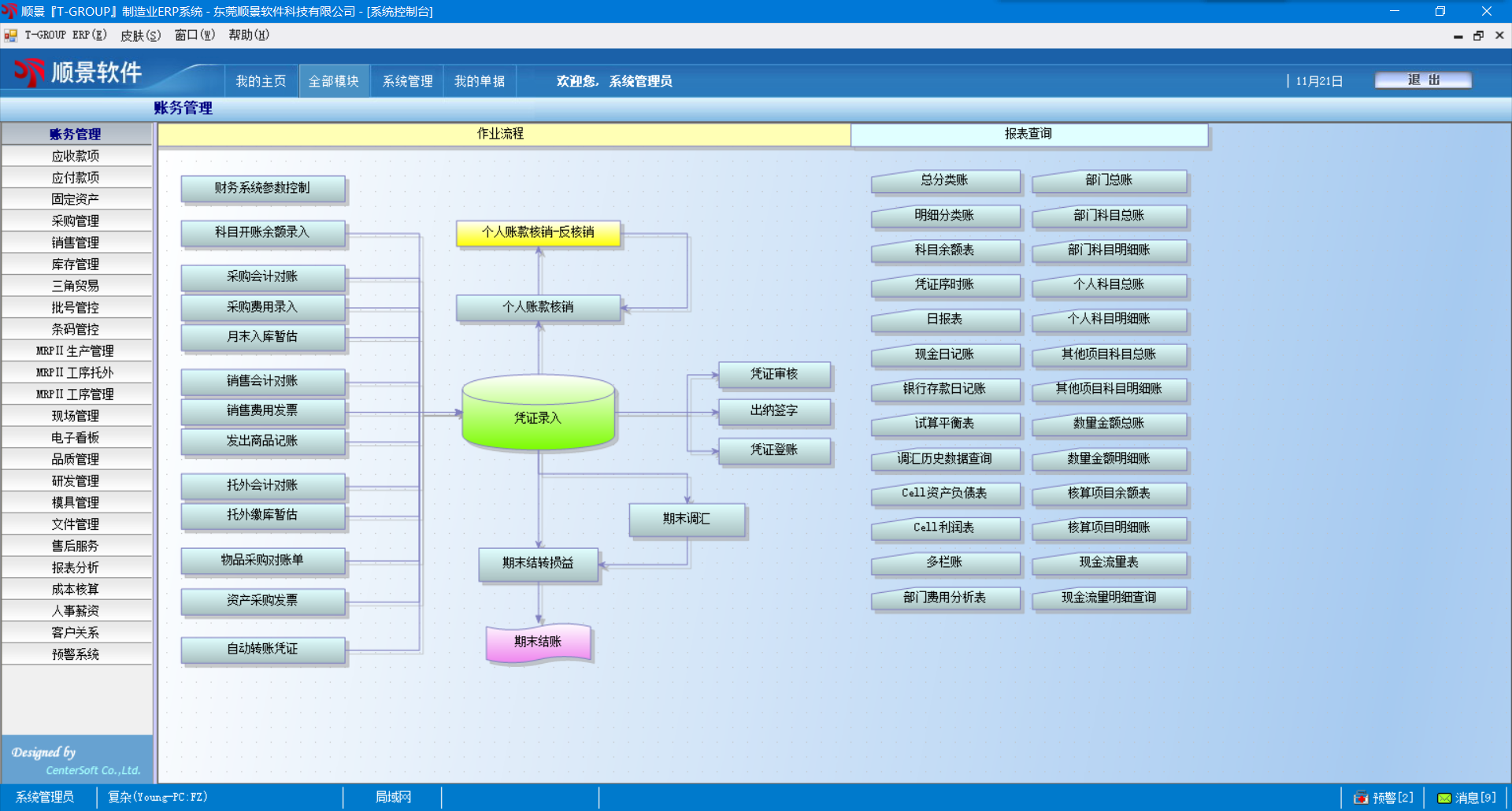 8. 月底损益结转后,自动出具资产负债表、损益表、现金流量表;